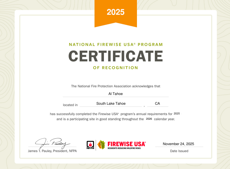 Congratulations, Al Tahoe Firewise — Your hard work reducing combustible materials has helped maintain our “in good standing” Firewise USA recognition. Continue to do your part by submitting your annual defensible space time and expense report.